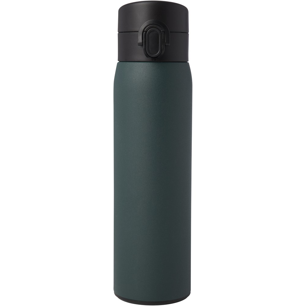 Elegante, RCS-zertifizierte Isolierflasche aus recyceltem Edelstahl mit einfachem Öffnungsmechanismus per Knopfdruck. Die Flasche ist auslaufsicher, und dank der Kupfer-Vakuumisolierung bleiben die Getränke mehrere Stunden lang heiß oder kalt. Das Fassungsvermögen beträgt 450 ml. Verpackt in einer Geschenkbox aus Recyclingkarton.