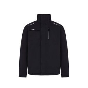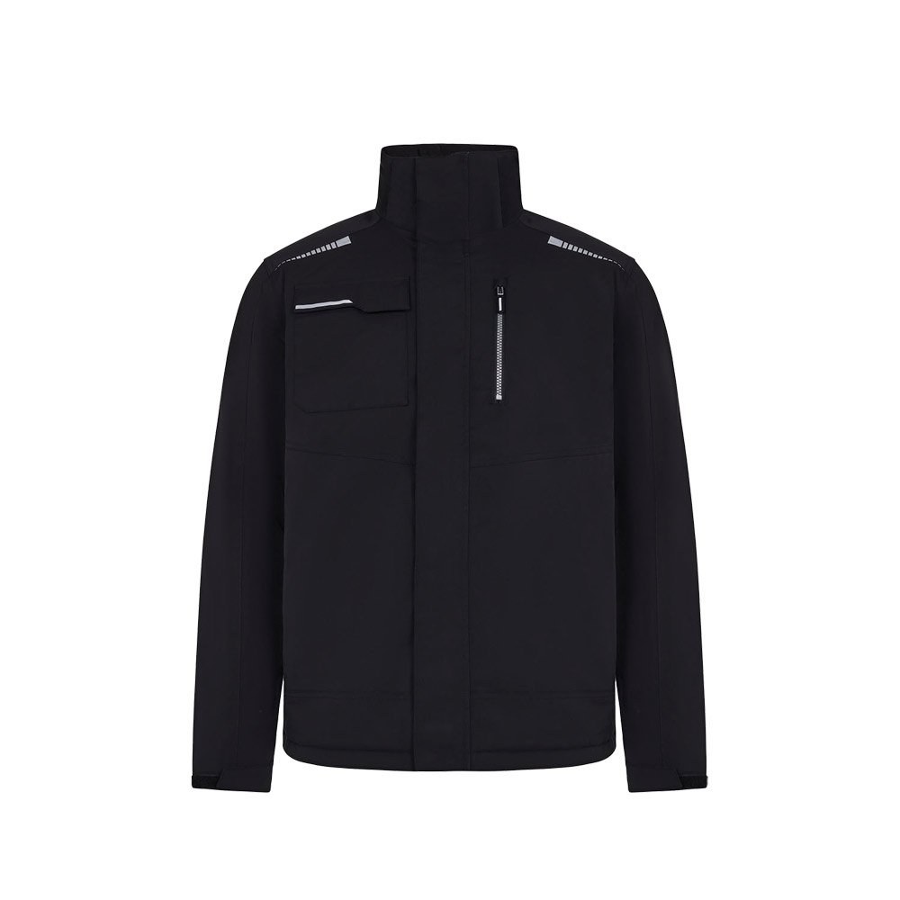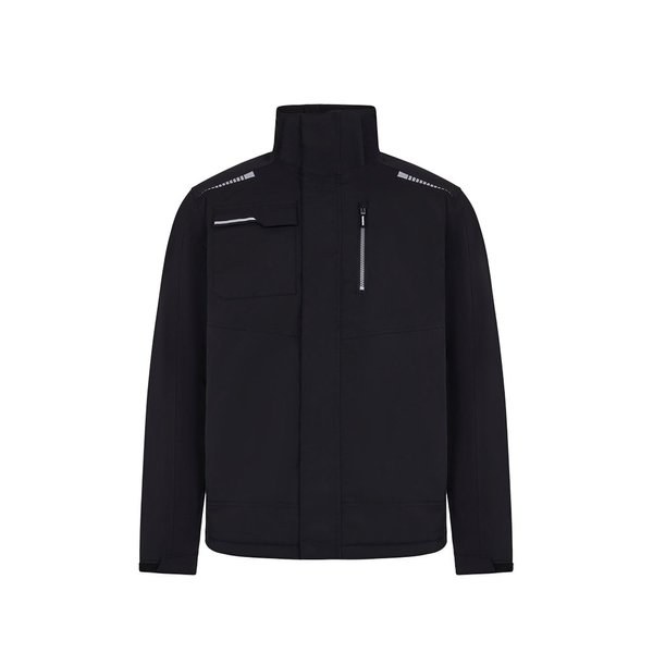 Gepolsterte Jacke (180 g/m²), aus recyceltem Polyester (50 %) und Polyester (50 %). Mit wasserabweisendem Stretchmaterial, heißversiegelten Nähten, reflektierenden Details und einem zentralen Reißverschluss. Die Jacke hat verdeckte Knöpfe und fünf Taschen (zwei Seitentaschen, eine Brusttasche links, eine Brusttasche rechts und eine Innentasche). Größen: S, M, L, XL, 2 XL, 3 XL
